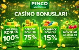 Pinco Casino bonusları Azərbaycandan oynayan istifadəçilər üçün aydın, cəlbedici və vizual baxımdan rahat şəkildə təqdim olunur. Platformada bonuslar yalnız mətn şəklində gizlədilmir, əksinə parlaq yaşıl tonlarda plaşkalar və bannerlər vasitəsilə ön plana çıxarılır. Bu yanaşma oyunçuların mövcud təklifləri asanlıqla görməsinə və düzgün seçim etməsinə kömək edir.